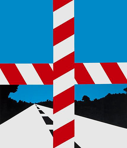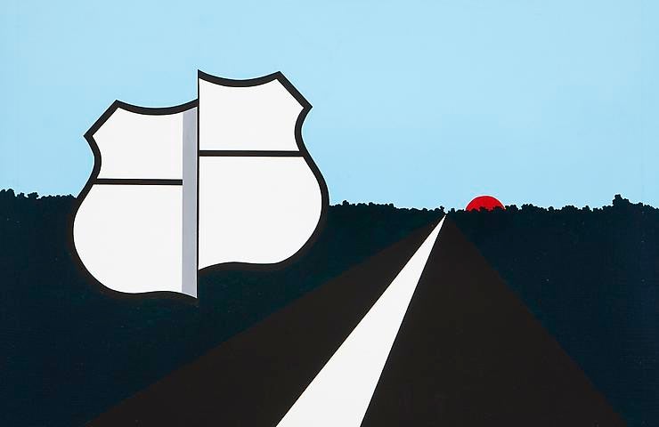 Like his Pop Art contemporaries, Allan D'Arcangelo found inspiration in the everyday and in mass culture. The artist incorporated commercial packaging, popular personalities, and advertising logos into his compositions. However, it was American highways, road signs, and the visual language of the country's modern terrain that particularly inspired the artist. His crisp compositions are infused with iconic symbols familiar to any traveler and his simplified perspectival landscapes put the viewer squarely in the driver's seat. As his oeuvre developed, he added overlapping barriers to the scenes, both painted and superimposed with actual objects that obscured the hard-edged vistas. These works, which are referred to as "Barriers" ultimately, led to his "Constellation" series that further refined the images into abstraction.