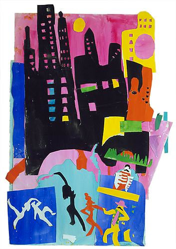 Kane’s unabashed love of color and its myriad possibilities take root in the tradition of Henri Matisse and continues to flourish in Kane’s work in collage. Pieces such as Boogie Woogie (1999), Night Creatures (1999), and Slaughter on 10th Avenue (1999) describe a vivid cityscape of musicians and dancers; the collages’ deep colors and deliberately riotous arrangement of figures and buildings capture the spirited nightlife of this world capital.