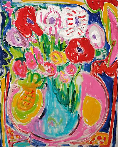 Born in Cleveland in 1937, Kane studied at Cornell University and at the Art Students League. At the League, his instructors included George Grosz and Will Barnet; Barnet in particular became a lifelong friend and important mentor. The older artist’s influence is apparent in the flattened pictorial structure and simplified shapes of Kane’s still life, Big Red (1986). Positano (2002), Red (2000), and Hey Luigi (2004) also employ collapsed perspectives and lush palettes. Barnet identified Kane’s abilities from his very early efforts: “The first time I saw Bob Kane’s work, I recognized his unique talent. His painting had an energy and an explosive force.”