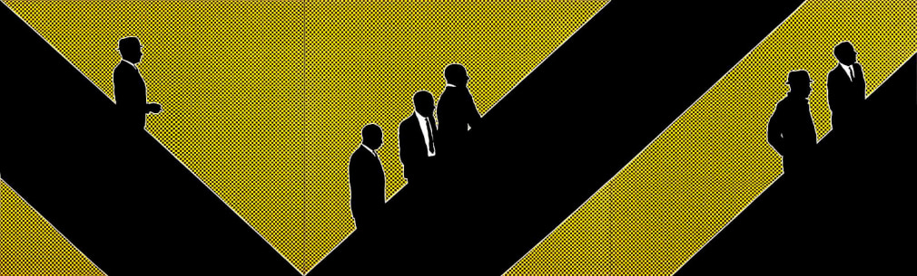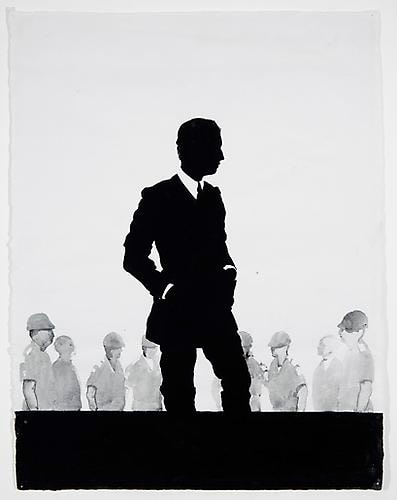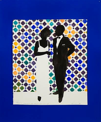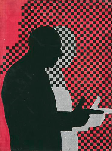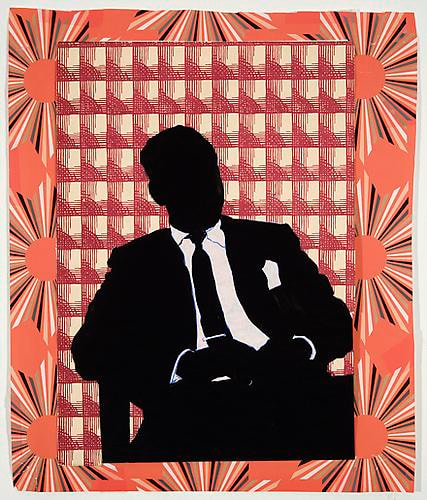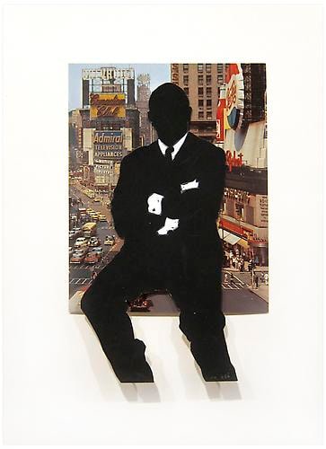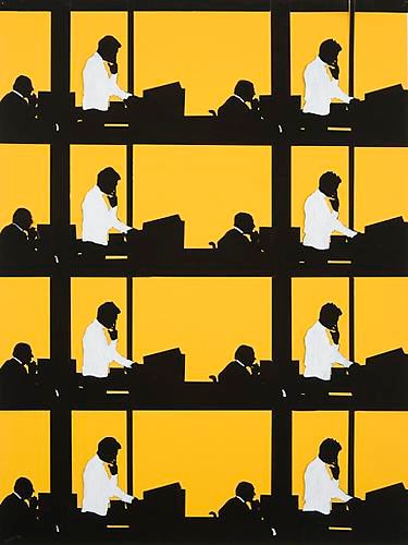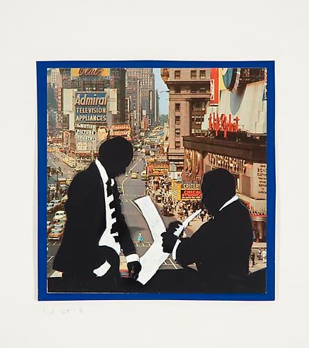 In her paintings in various media (gouache, tempera, watercolor, acrylic, and oil), collages, and three-dimensional plastic sculptures from this period, Weber depicts figures with her hallmark use of black silhouettes against brightly colored or patterned backgrounds. Munchkins I, II, & III (1964), an imposing triptych spanning seventeen feet, conveys the overwhelming monotony of Organizational Men spied through the transparent facades of their modernist buildings being conveyed to and from their offices like little Munchkins within the world of Oz. In Lever Building 2 (1970), the repetition of frames—like floors in the landmark edifice—emphasizes the alienation and conformity of corporate culture. Weber’s work is especially prescient for drawing out ideas about the ways social roles shape the behavior and dress of men as well as women.