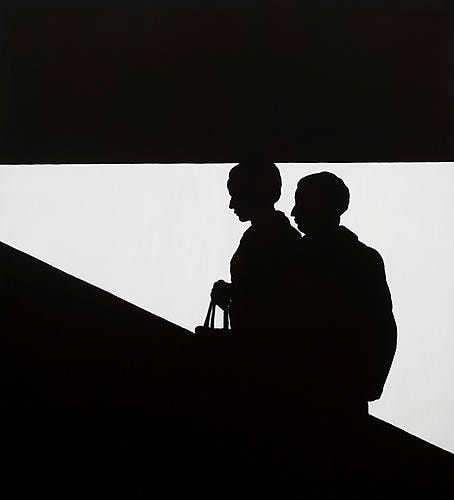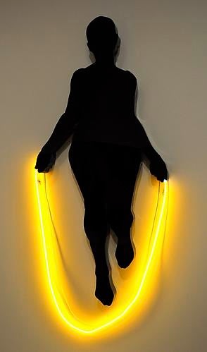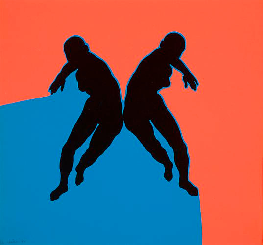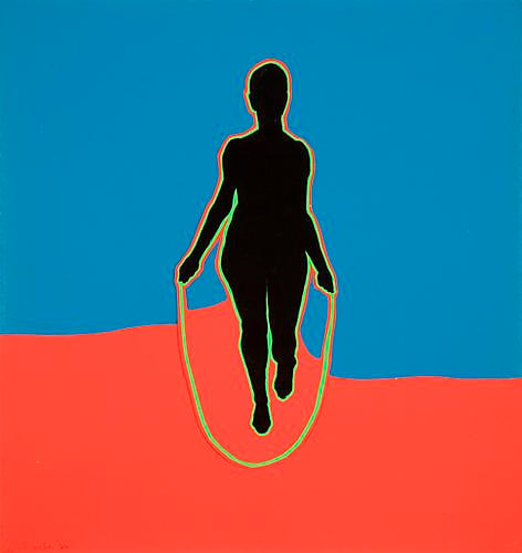 Weber shares with her Pop contemporaries an engagement with the rhetoric of commercial imagery that was then redefining the postwar landscape: she favored hard-edged clarity, bold color, and slick surfaces. Jump Rope Lady (1966) pairs the techniques of outlining and silhouetting with the use of highly saturated, unmodulated areas of color to create a striking composition that vibrates with the sense of stopped motion. Set against moiré or checkerboard patterns, Tiffany blue backgrounds, or iconic cityscapes, such as the Chrysler building’s ornate spire, her art is at once particular and universal, mod and classical.