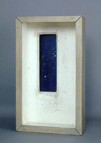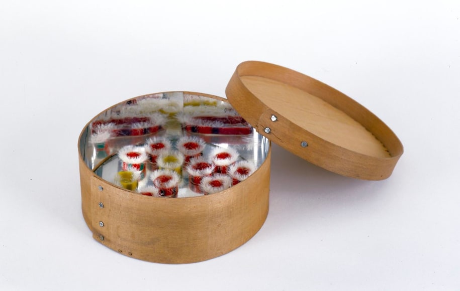 Contemporary artists have long been attracted to the flexibility of the box medium, finding it allowed them a unique format in which to incorporate many technical, material, and philosophical points of view. A student of William Baziotes and Hale Woodruff, Leo Rabkin (b. 1919) has been making boxes since the 1950s, with a particular attention to the viewer’s intimate interaction with the material. An avid collector of folk art and the former president of the American Abstract Artist group, he was an early contributor to the development of conceptual art, in which meaning lies with viewer experience rather than the rarified art object. In Fabrics for Mending, 1970s, fluffy dandelion seeds float within a wooden box and their soft, tender quality highlights the delicacy of the natural world. The materials in Habanello, c. 1991 appear equally surprising, with the contrasting textures of metal and stone appealing to the senses.