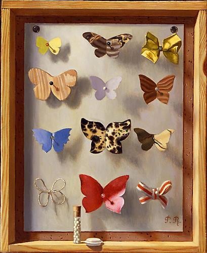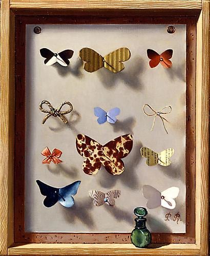 Cornell’s imagery has a unique artistic kinship with the Magic Realist painting of the French artist Pierre Roy (1880-1950). “Image in the Box” examines the powerful visual associations between Roy’s and Cornell’s work, a subject that has received little attention within Cornell scholarship, with the exception of the groundbreaking research undertaken by Jeffrey Wechsler, who presented the lecture “A Source for the Imagery of Joseph Cornell” at the Whitney Museum of American Art in New York in 1978. Highlighted in this exhibition, his analysis of the two artists reveals a considerable amount of shared imagery. Roy’s motifs include the butterfly featured in Papillon, 1933, as well as wineglasses, hanging weights, sand, shells, eggs, scientific charts, pins, paper flags, and ceramic statuettes arranged in compositions strikingly similar to Cornell’s. In Roy’s Pêcherie de Cétacés, 1926, the artist paints an open rear wall into his boxes, a technique Cornell echoed by placing photographs or astronomical imagery at the back of his boxes.