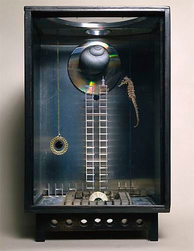 Ted Victoria (b. 1944) further extends the stylistic and technical possibilities of box imagery by his inclusion of projected and moving images. Victoria began his avant-garde experimentation with projected images in the 1960s and 1970s, after being exposed to Pop art, the assemblages of Robert Rauschenberg, and Cornell’s films. His construction incorporates technology, including low-tech tools—lenses, clockwork mechanisms, light bulbs, and the use of the camera obscura—in order to project images of actual objects. These include a miniature chair in The Magic Chair, 2008 and a ring, miniature tire, and cigarette lighter in Evidence, 1992-93. Thus, the artist’s works epitomize the notion of “the image in the box.”