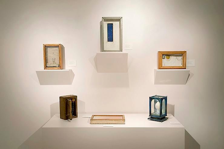 Contemporary artists have long been attracted to the flexibility of the box medium, finding it allowed them a unique format in which to incorporate many technical, material, and philosophical points of view. A student of William Baziotes and Hale Woodruff, Leo Rabkin (b. 1919) has been making boxes since the 1950s, with a particular attention to the viewer’s intimate interaction with the material. An avid collector of folk art and the former president of the American Abstract Artist group, he was an early contributor to the development of conceptual art, in which meaning lies with viewer experience rather than the rarified art object. In Fabrics for Mending, 1970s, fluffy dandelion seeds float within a wooden box and their soft, tender quality highlights the delicacy of the natural world. The materials in Habanello, c. 1991 appear equally surprising, with the contrasting textures of metal and stone appealing to the senses.