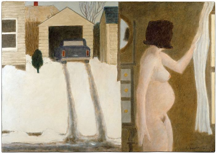 Throughout his career, Vevers has depicted the world around him and his life experiences. Landscapes, such as the stark, angular beach scene, Gull and Ice Floes (1963-69), are rendered modern through bold, reductive compositions. Personal associations, including the family move documented in Transition (1964), are also important subjects. The quotidian, even domestic imagery is created by using employing multiple scenes within a single canvas.