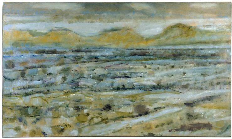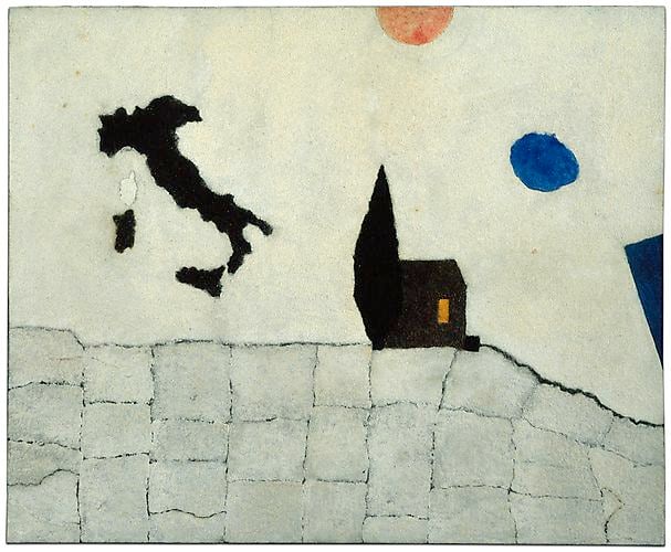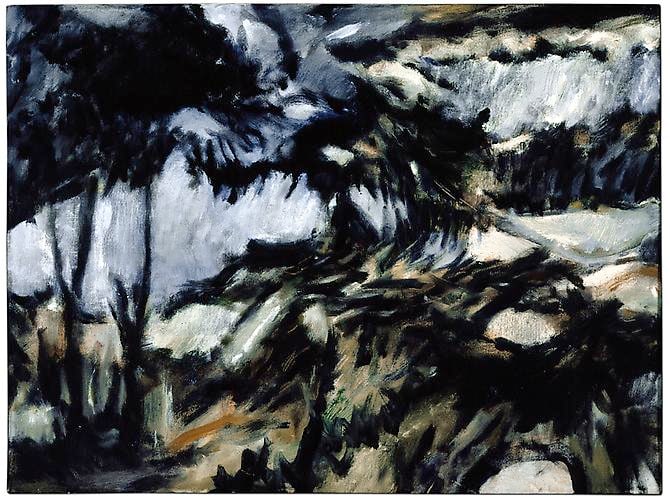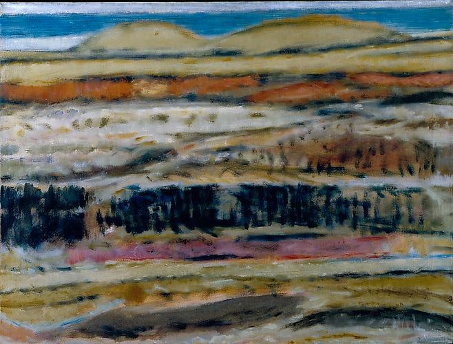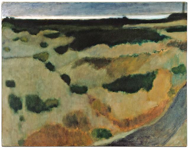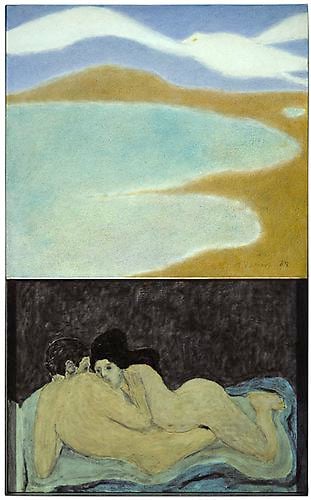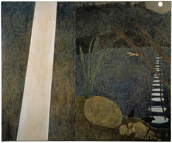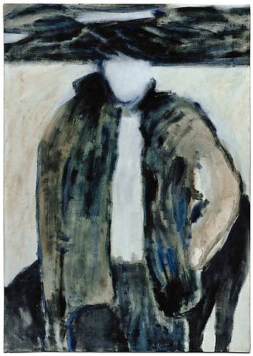 The exhibition will include 28 paintings and collages spanning Vevers’s long career. Early works, such as the “winter paintings” Winter Landscape (1955) and Winter Portrait (1957), employ strong, jagged brushstrokes and palettes dominated by greys, blues, and lavenders. In this early period, Vevers deftly explored the possibilities of abstraction and figuration. In the early 1960s, his paintings moved further into a representational style and narrative subjects. Works such as Hound Voice (1961), its title taken from a Yeats poem, have a classical grandeur to them; their monumental figures and simplified forms suggest humanity’s primordial beginnings. And as in the lively, intimate Moon Dog of 1961, these paintings are characterized by simplified forms and rich, vivid colors.