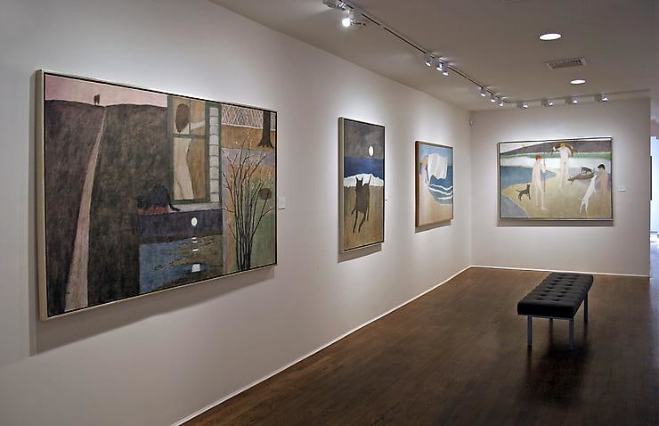 The exhibition will include 28 paintings and collages spanning Vevers’s long career. Early works, such as the “winter paintings” Winter Landscape (1955) and Winter Portrait (1957), employ strong, jagged brushstrokes and palettes dominated by greys, blues, and lavenders. In this early period, Vevers deftly explored the possibilities of abstraction and figuration. In the early 1960s, his paintings moved further into a representational style and narrative subjects. Works such as Hound Voice (1961), its title taken from a Yeats poem, have a classical grandeur to them; their monumental figures and simplified forms suggest humanity’s primordial beginnings. And as in the lively, intimate Moon Dog of 1961, these paintings are characterized by simplified forms and rich, vivid colors.