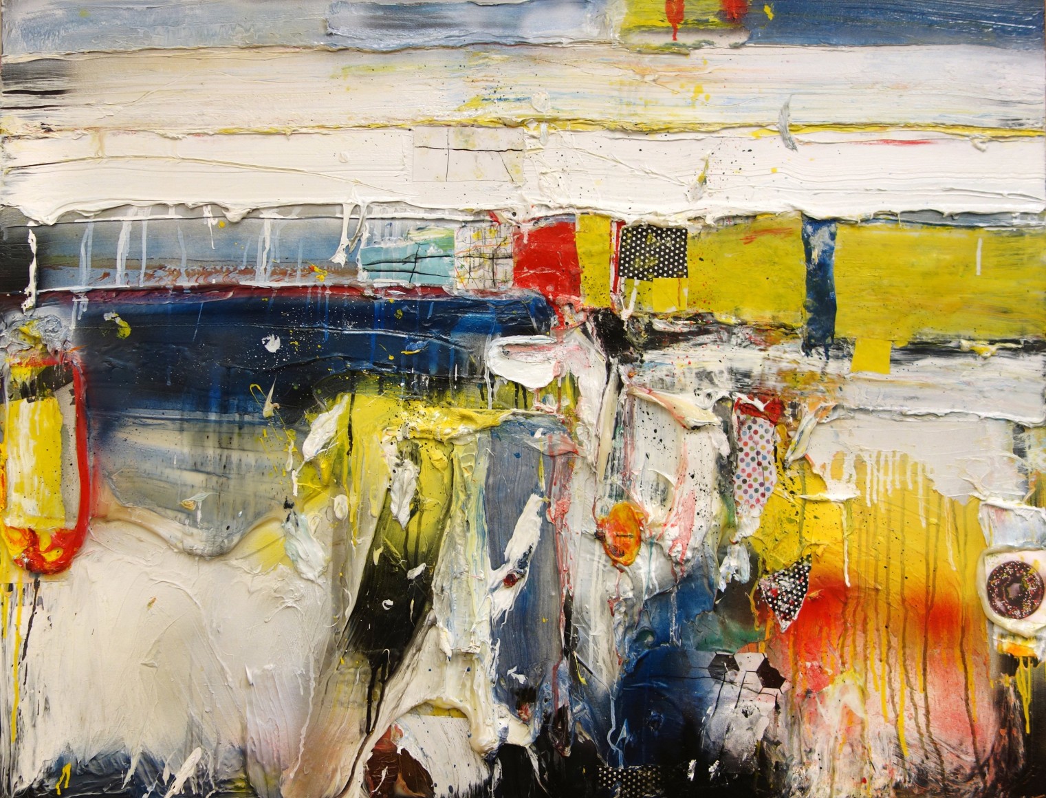 Rooted firmly in the New York School, Robert Baribeau employs the expressive gestures and heavy impastoes of Abstract Expressionism in his canvases, sculptures, and works on paper. Baribeau infuses his surfaces with found ephemera such as wrapping paper and fabric, building upon already dense and highly tactile layers of paint. These collages reflect the voracious aesthetic appetite that is characteristic of his work that seems to vacuum up materials into its surfaces in a manner akin to the combine paintings of Robert Rauschenberg. The result, as Grace Glueck deemed them in a review for the New York Times, is a “joyous riot” of colors and textures (1).
